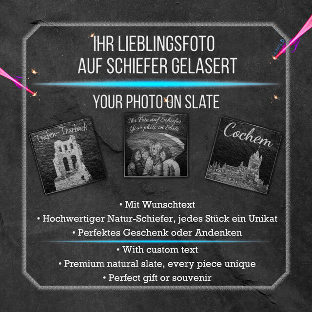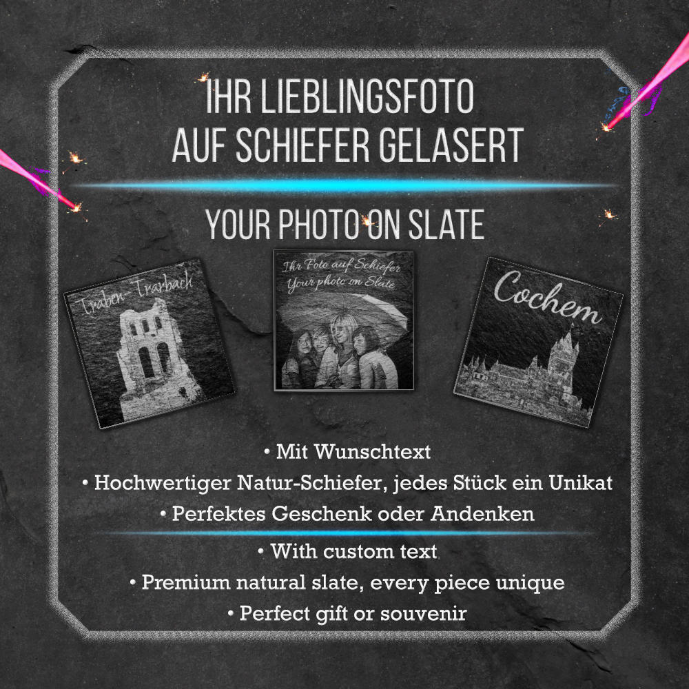 - Ihr Foto in HD+ Qualität auf Schiefer gelasert.